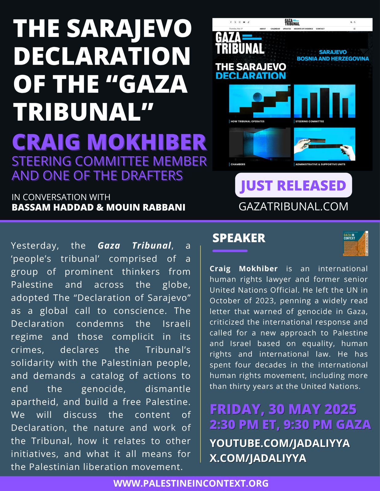 Yesterday, the Gaza Tribunal, a 'people's tribunal' comprised of a group of prominent thinkers from Palestine and across the globe, adopted The "Declaration of Sarajevo" as a global call to conscience. The Declaration condemns the Israeli regime and those complicit in its crimes, declares the Tribunal's solidarity with the Palestinian people, and demands a catalog of actions to end the genocide, dismantle apartheid, and build a free Palestine. We will discuss the content of Declaration, the nature and work of the Tribunal, how it relates to other initiatives, and what it all means for the Palestinian liberation movement.