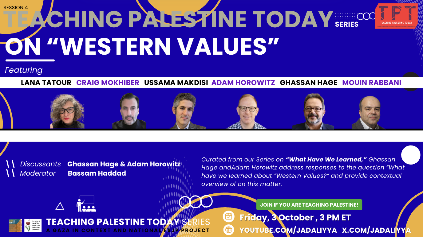 Join our fourth session of the Pedagogic Series “Teaching Palestine Today". This session addresses “Western Values,” curated from our speakers’ responses to the question “What have we learned about “Western Values” in the past year+?” Featuring Lana Tatour, Ussama Makdisi, Adam Horowitz, Craig Mokhiber, Mouin Rabbani, and Ghassan Hage. Our discussants are Ghassan Hage and Adam Horowitz, with Bassam Haddad as moderator
