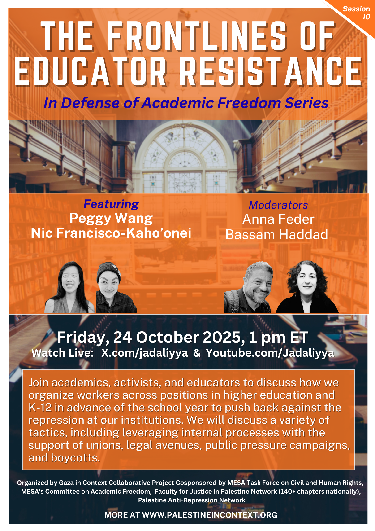 Organized by DC, Maryland, & Virginia Faculty for Academic Freedom and Gaza in Conrtext Collaborative Project; Cosponsored by MESA Task Force on Civil and Human Rights, MESA's Committee on Academic Freedom, Faculty for Justice in Palestine Network (140+ chapters nationally)