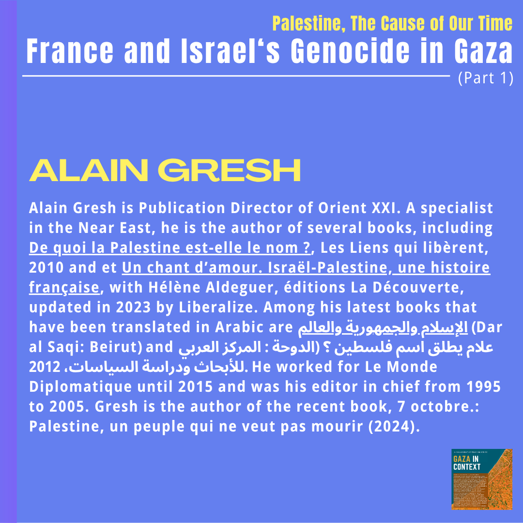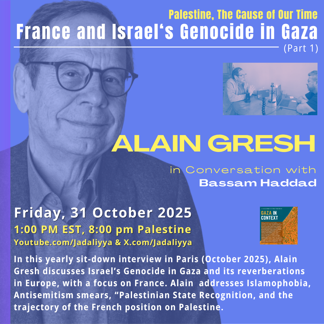 In this yearly sit-down interview in Paris (October 2025), Alain Gresh discusses Israel’s Genocide in Gaza and its reverberations in Europe, with a focus on France. Alain addresses Islamophobia, Antisemitism smears, “Palestinian State Recognition, and the trajectory of the French position on Palestine.
