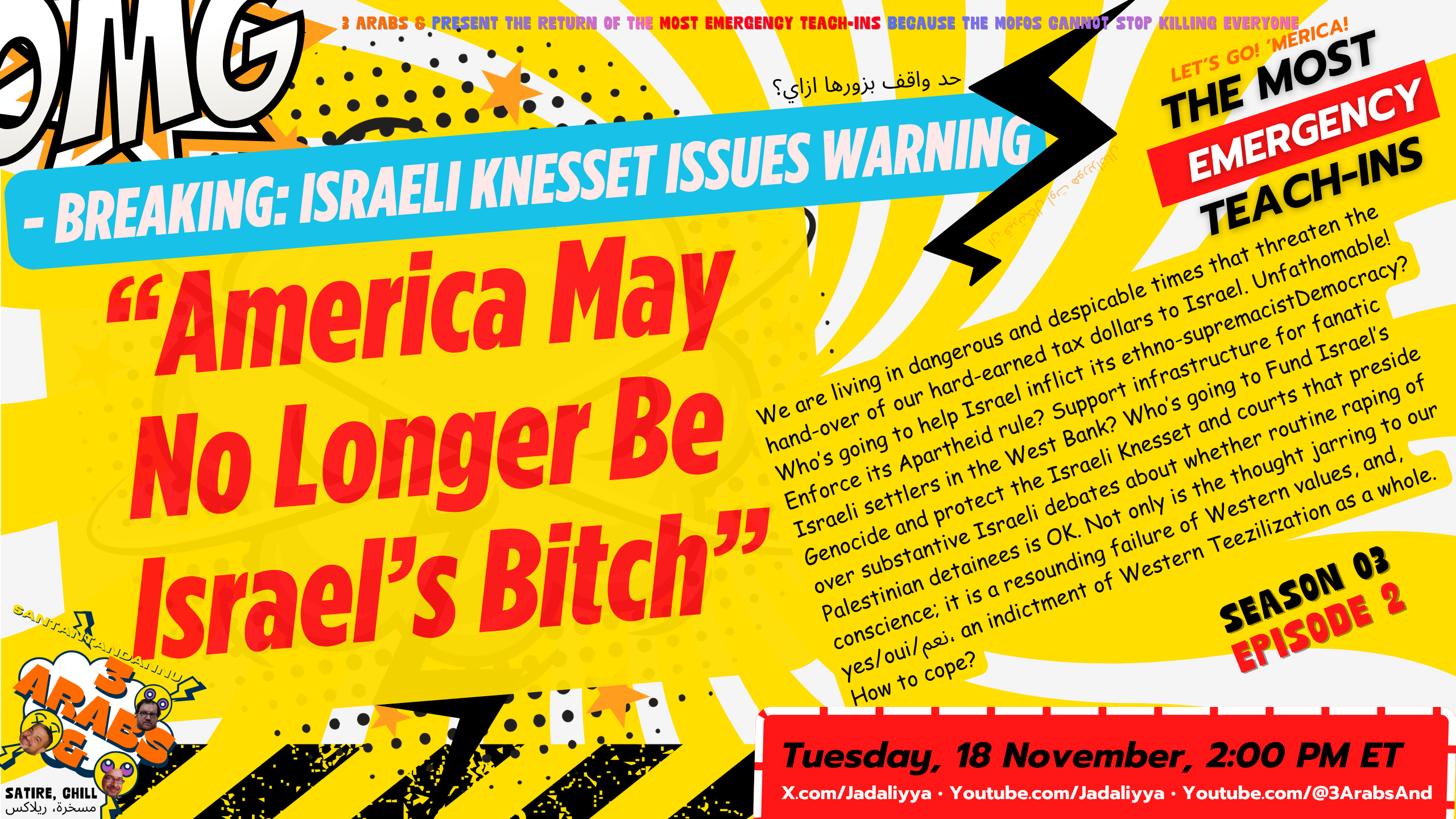Oh my god! Our next Emergency Teach-In addresses head on the Breaking News from the Israeli Knesset, and we quote their statement: “AMERICA MAY NO LONGER BE ISRAEL'S BITCH!”