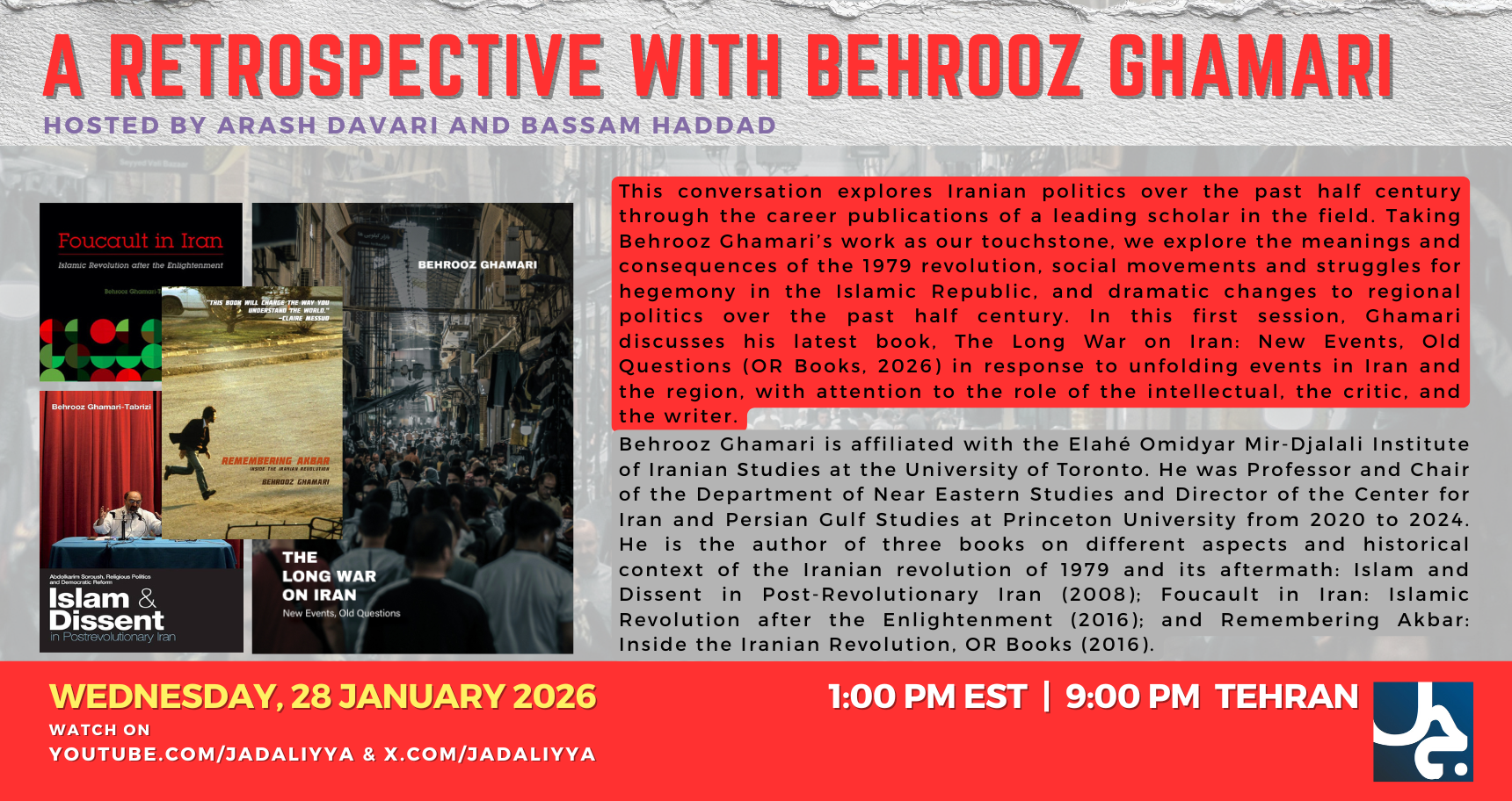 The Long War on Iran: A Retrospective with Behrooz Ghamari explores Iranian politics over the past half century through the career publications of a leading scholar in the field. Taking Behrooz Ghamari’s work as our touchstone, we explore the meanings and consequences of the 1979 revolution, social movements and struggles for hegemony in the Islamic Republic, and dramatic changes to regional politics over the past half century. In this first session, Ghamari discusses his latest book, The Long War on Iran: New Events, Old Questions (OR Books, 2026) in response to unfolding events in Iran and the region, with attention to the role of the intellectual, the critic, and the writer.