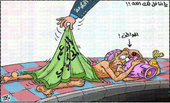 Maybe the first one is the most telling. We see Abu Mahjub, a Jordanian citizen, sleeping with the gas cylinder, which is used in Jordan for heating homes during the harsh winter. We see the blanket covering him being lifted by the state, saying “Al-da’am al-hukumi.” So it is really the “belifting” of the citizen. It says a lot about how energy justice and injustice are experienced. First, a bodily experience and politics is at the heart of this notion. We also see Abu Mahjub on one of the other representations being extorted by an electricity meter and a gasoline pump. In this series, Hajjaj speaks about the “meter,” the machines that count energy, also referring to a sense of abstraction coming with the infrastructure upon which people have become dependent. The last drawing is a very strange oven called al-marba‘aniyya, the oven of the “forty coldest days in winter” as peasants in Bilad al-Sham refer to, that symbolizes all the “bricolage” (DIY efforts) that citizens need to implement to cope with threats to their access to energy, like collecting wood for heat when gas is not affordable. The cartoons symbolize some of these experiences: the state revoking the citizen's security, and everyday life being absolutely dependent on these infrastructures to access a certain level of consumption, comfort, and wealth. This dialectic is very important to start understanding energy politics and energy justice.