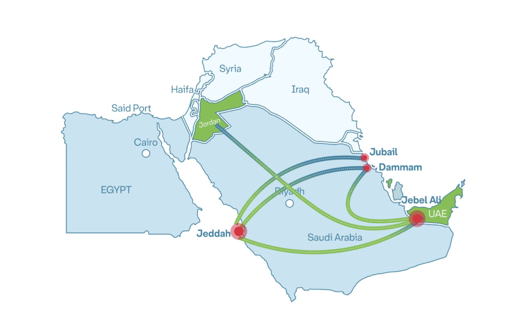 The PR and visual materials used by Gulf partners suggest that they are not entirely comfortable with the politics of normalization: the maps and imagery they use may resemble Israeli illustrations, but with two very conspicuous differences. First, the visual material by Trucknet lists the logo of all Gulf and Egyptian partners (Puretrans, Cox Logistics, and WWCS).[23] There are no logos of any partners on the webpage of Puretrans. Cox Logistics’s website entails some partner institutions, but nowhere do we see any reference to Israeli partners. Second, the map of Puretrans (see Picture 2) indicates its interest in cross-peninsula connections but the arrows that connect the harbor of Jebel Ali indicate two countries in green: the UAE and Jordan not Israel or Egypt. It is as if the Mediterranean reaches the borders of Jordan.[24] The fact that Israel is not represented in the Emirati visual material is evidence that there is a reluctance for Gulf actors to display the possible extent of normalization with Israel at a time of genocide and ecocide in Gaza.