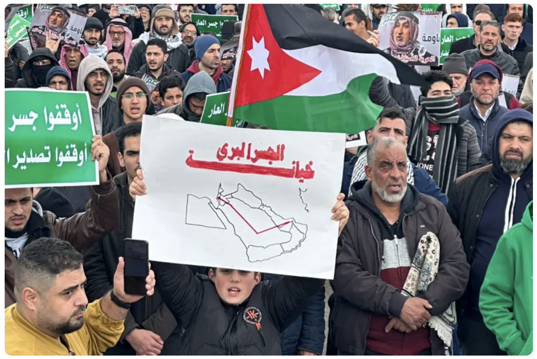 Picture 3: Protests in Amman, April, 2024. (Source: Al-Jazeera. The boy carries a poster with the text “The land bridge is a betrayal”. The map traces the line that crosses Saudi and Jordan and connects Dubai to Haifa. The green signs read “Stop the bridge of shame!” (jisr al-‘aar), add “Stop the exports [to Israel]”.)