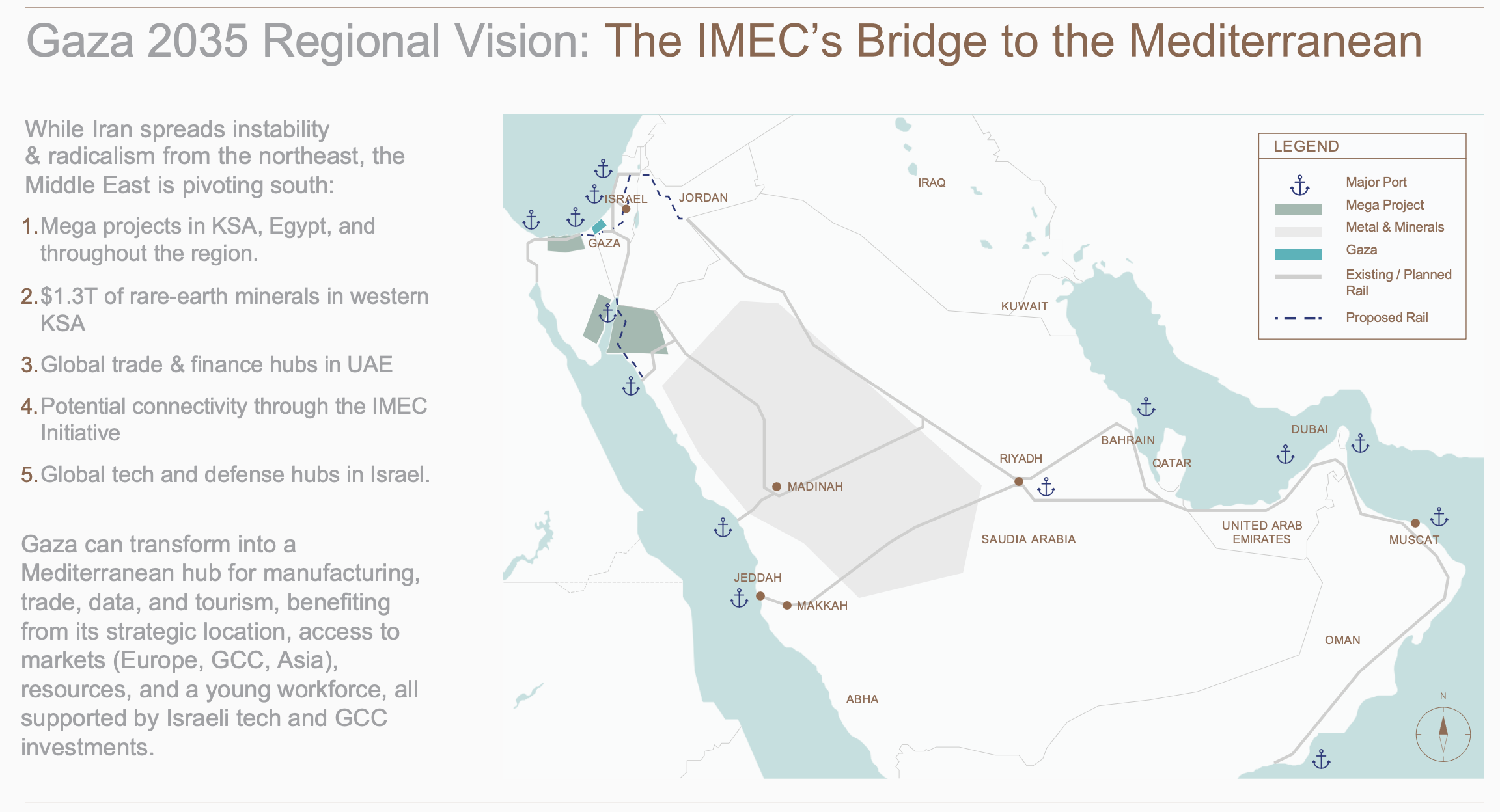 The map of Picture 4 seems to satisfy all parties: Gaza should be reconstructed and connected to a “Mega Project” from Rafah to the Al-Arish region (producing, among others, electric cars); Israel’s harbors of Eilat and Haifa are further integrated in the IMEC projects; Saudi’s infrastructural developments (railways and NeoM, marked in grey-green east of the Sinai) gain primacy in these overland routes; the Gulf monarchies and Emirates are offered new connections free of the Hormuz chokehold; while the U.S. gain access to rare earth minerals in Saudi (zone marked in grey in Picture 4).