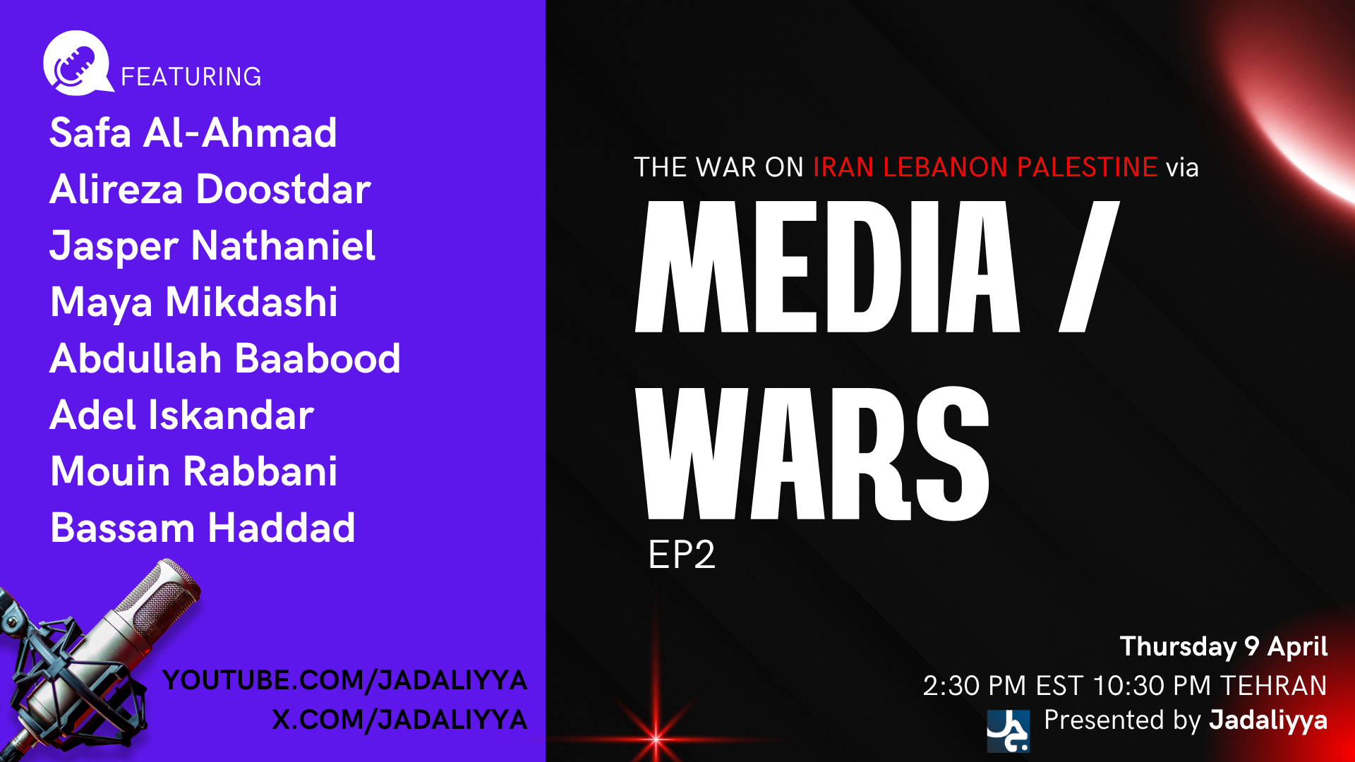 This episode of Media Wars comes on the heels of Israel unprecedented murderous missile attack on Beirut that claimed hundreds of lives and casualties, breaking the tenative ceasefire agreement set the night before by the United States and Iran. Our speakers and hosts will address the reality and media portrayal of the war on Iran and Lebanon, the expansion of settlements and violence against Palestinians in the West Bank, the precarious situation in the Arab Gulf states, as well as the nature and impact of Al-Jazeera Network.