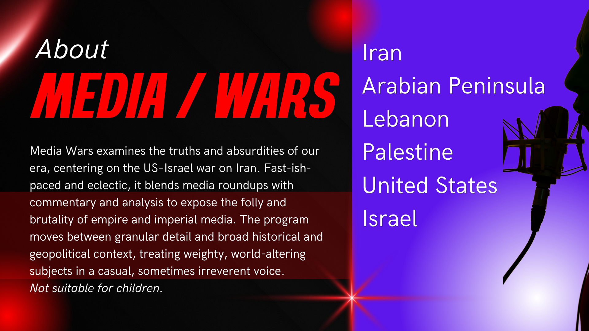Media Wars examines the truths and absurdities of our era, centering on the US–Israel war on Iran. Fast-paced and eclectic, it blends media roundups with commentary and analysis to expose the folly and brutality of empire and imperial media. The program moves between granular detail and broad historical and geopolitical context, treating weighty, world-altering subjects in a casual, sometimes irreverent voice. Not suitable for children.
